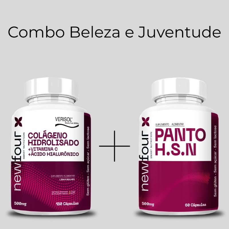O Colágeno Hidrolisado da New Four, combinado com o Panto HSN, oferece um cuidado completo para a sua pele, cabelos e articulações.